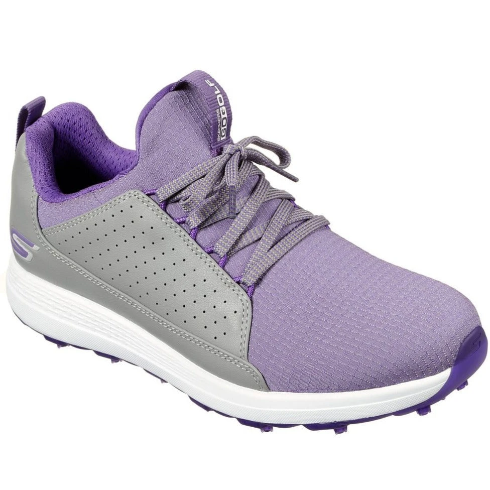 The Skechers Go Golf Max Mojo Ladies Golf Shoes are water-resistant due to the Dri-Lex moisture management interior so your feet will stay dry and protected when completing your rounds this season. The GOGA Max technology and ULTRA FLIGHT midsole cushioning offer comfort and support when moving around the golf course. This spikeless option offers durable grip so you are guaranteed the perfect traction when transporting around the golf course. The continuous collar offers added support and comfort. Keep your feet comfortable with the soft breathable mesh fabric toe and instep panels for the breathable comfort. This is a stylish option with the smooth full grain leather upper and the purple colour. Making this an all round perfect option when completing your rounds of golf this season.