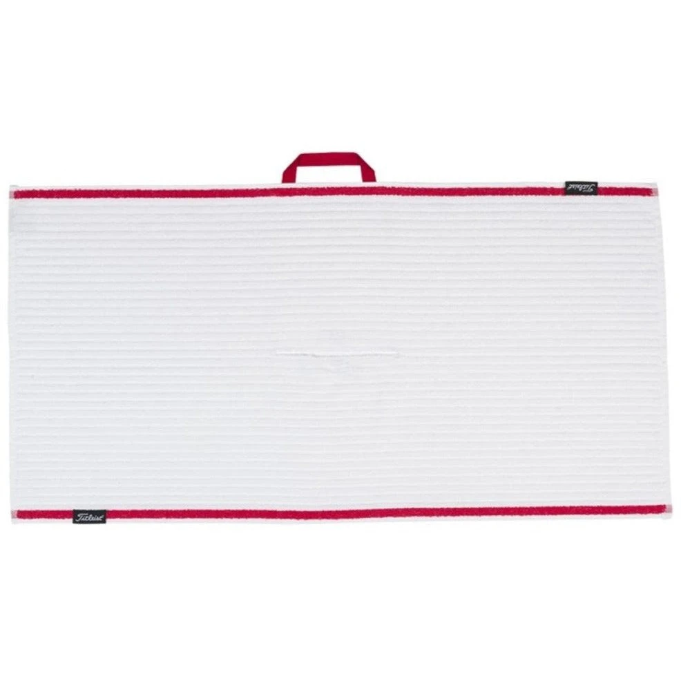 The Titleist Tour Staff Golf Towel is a fantastic Tour-inspired design that has been created from woven ribbed pattern white fabric, highlighted with red stripes and Titleist branding for an authentic look. The larger towel design is a tour-preferred innovation that makes cleaning clubs simple. A large centre slit easily fits over club heads for simple and rapid cleaning.
